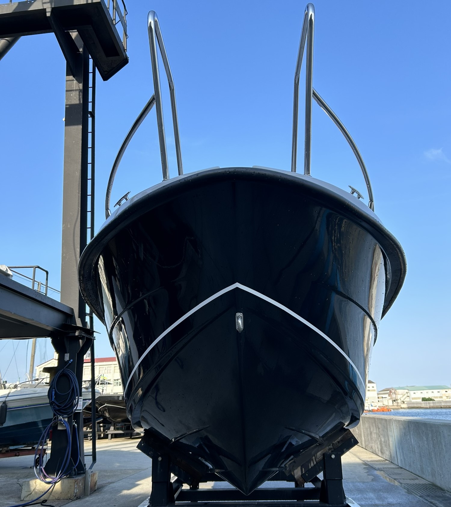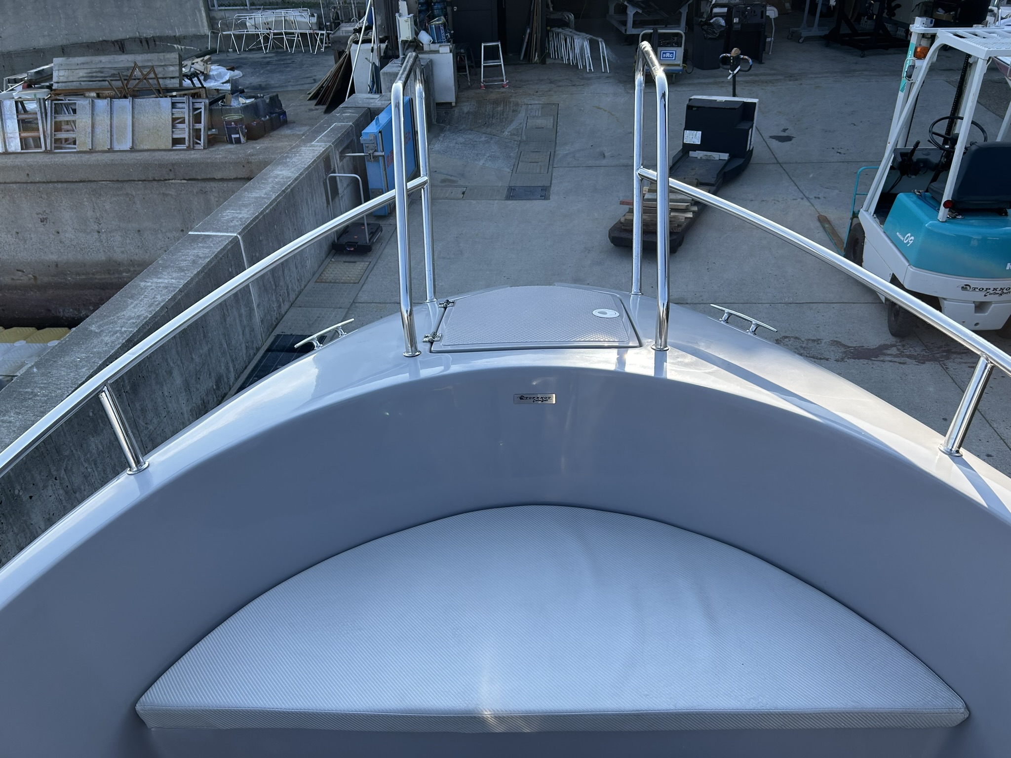 PRIDEの一体型のサイド・バウレール、エンジンウエルレール、クリート類等は全て標準装備。 |