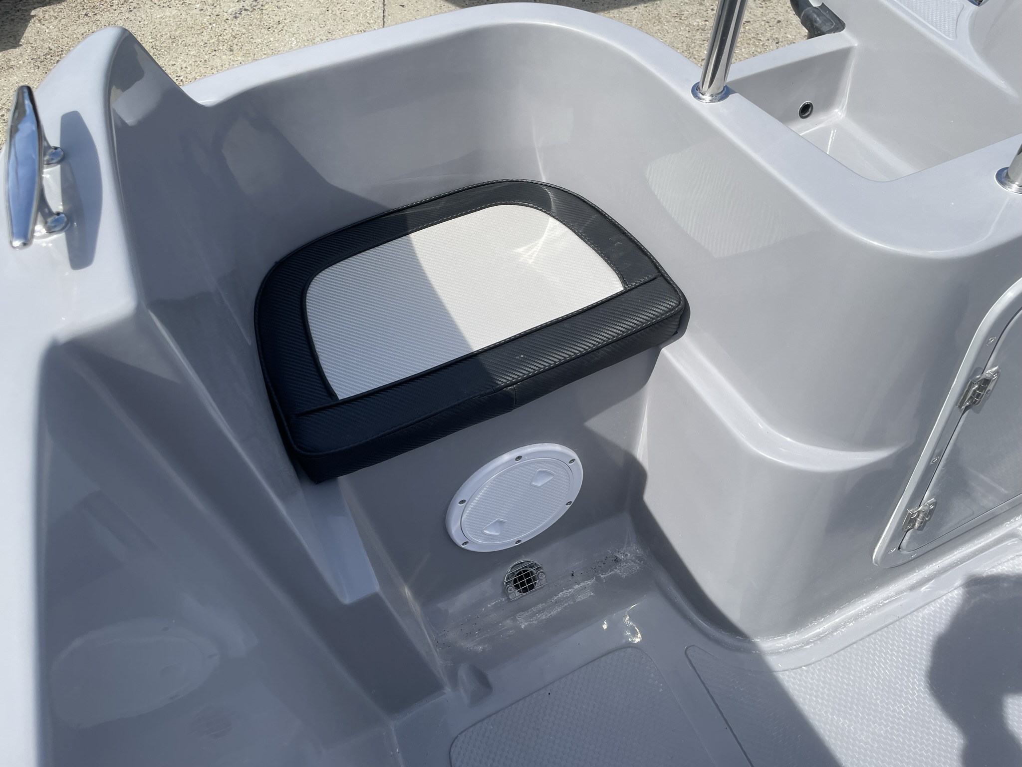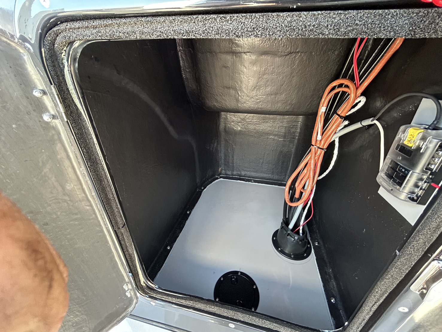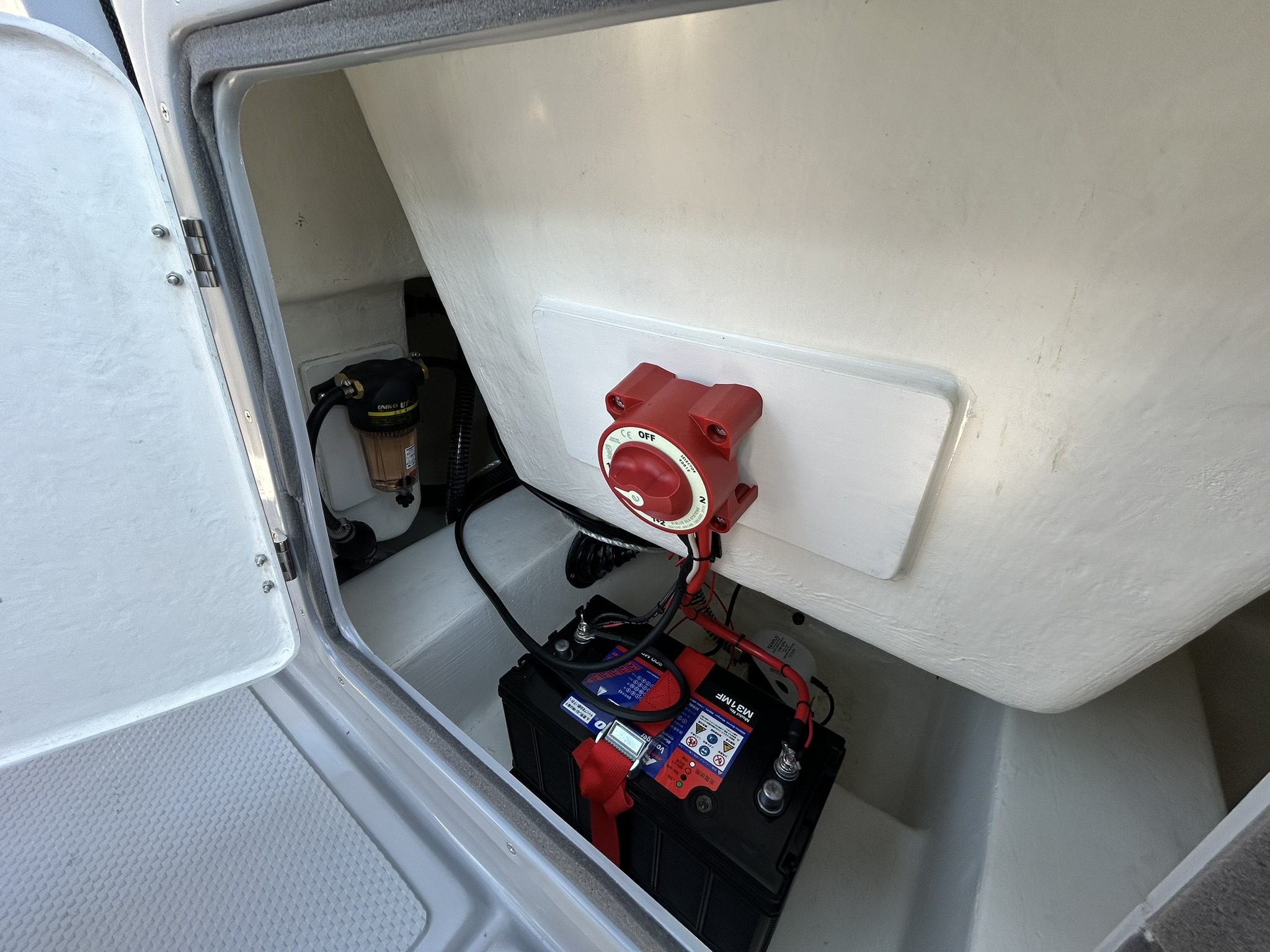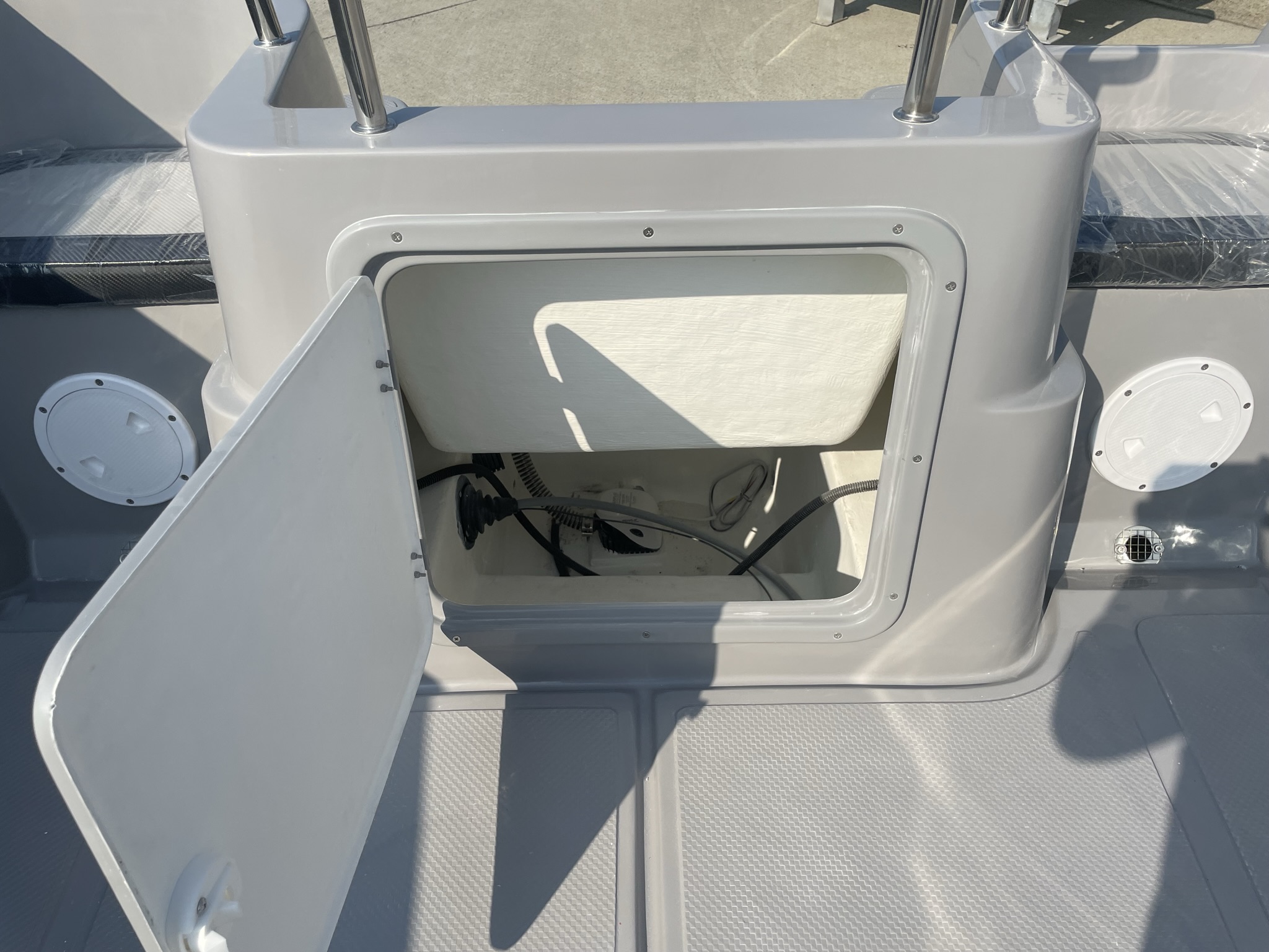 大型センターハッチ内に標準のビルジポンプとバッテリー、スイッチ搭載スペース。 |