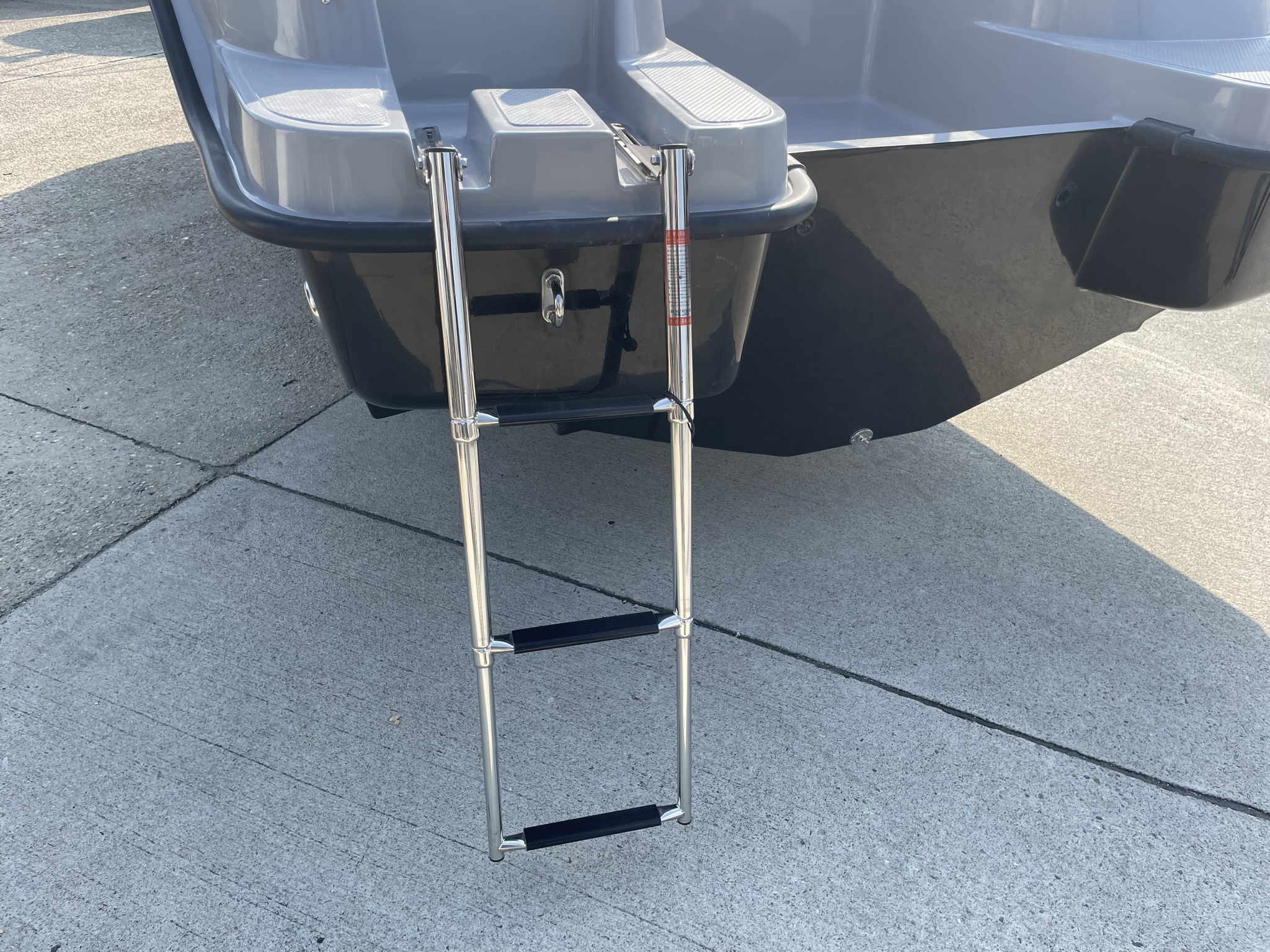 船体へ一体化された格納式ステンレストランサムステップラダー。 |
