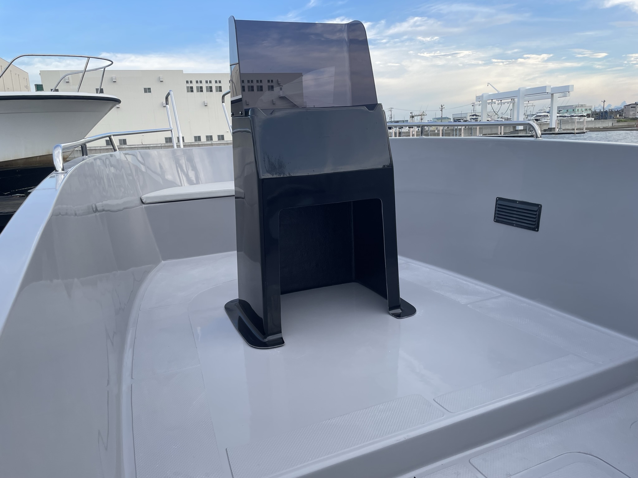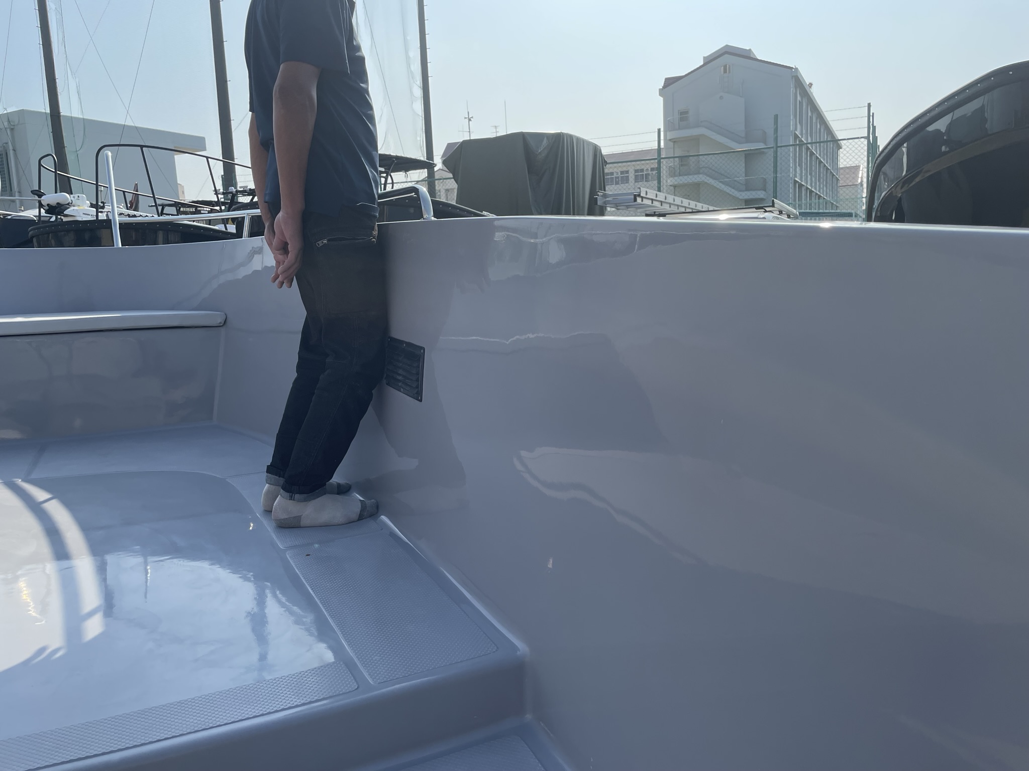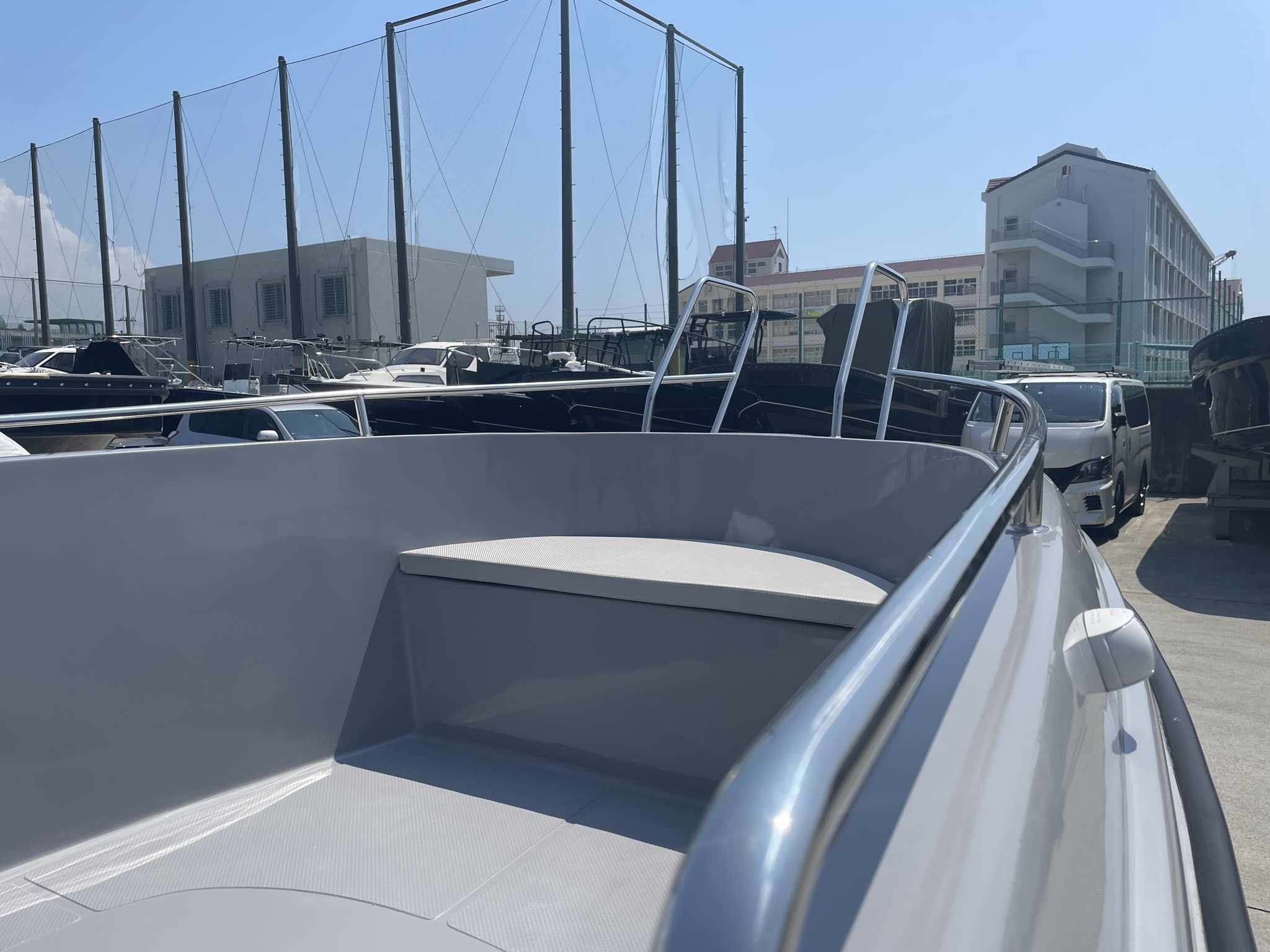 船体製造:船体・デッキ・全てのパーツが真空引工法。他メーカー同厚みでもFRPや樹脂の密集度合が異なり、 耐久性や強度を一段と向上する事ができました。また、デッキ心材部にはハニカムコアマットを採用する事により長年の利用で起きる「ヘタリ」を極限まで阻止。 水吸収を知らない丈夫なデッキを実現致しました。 |