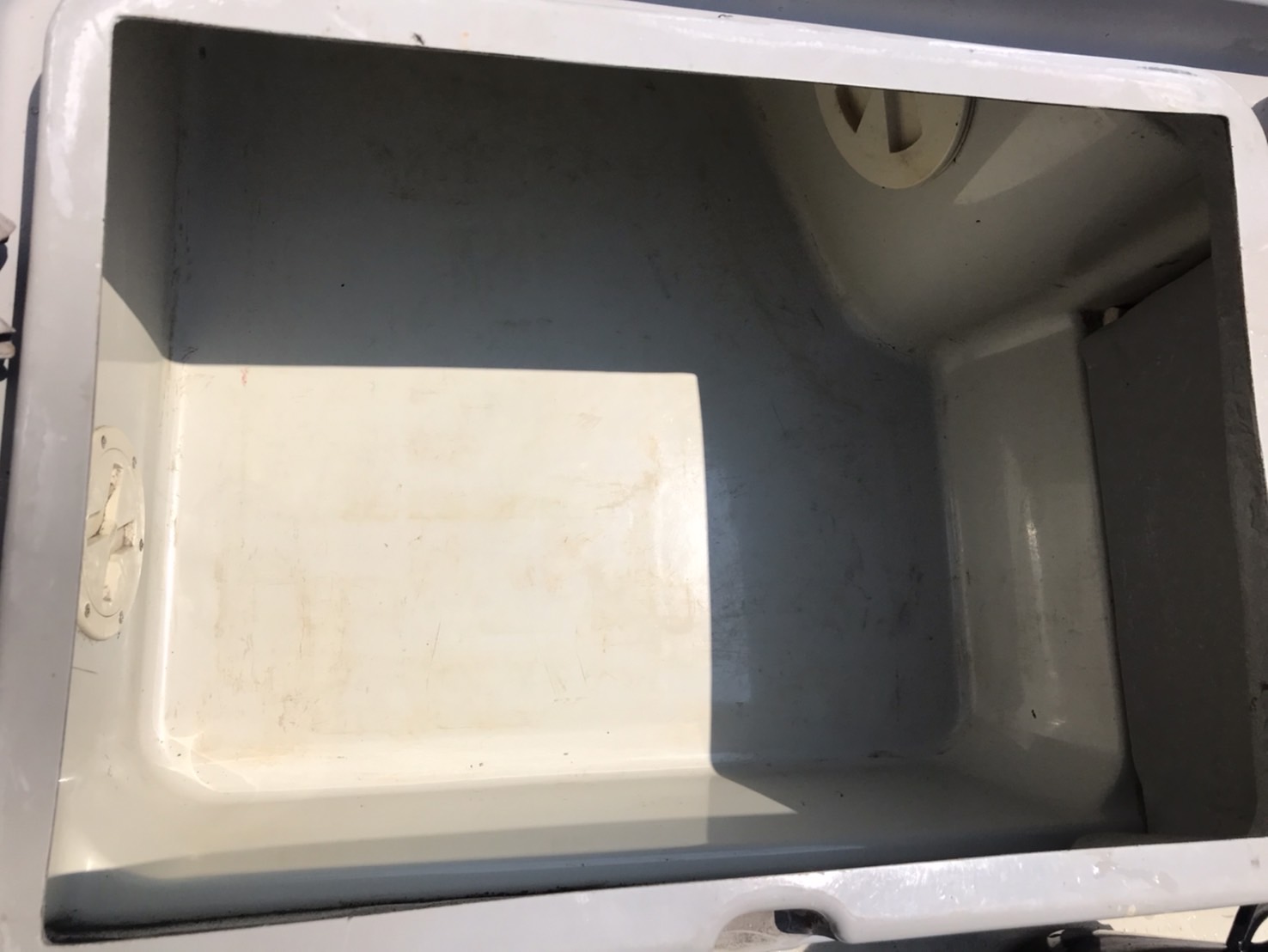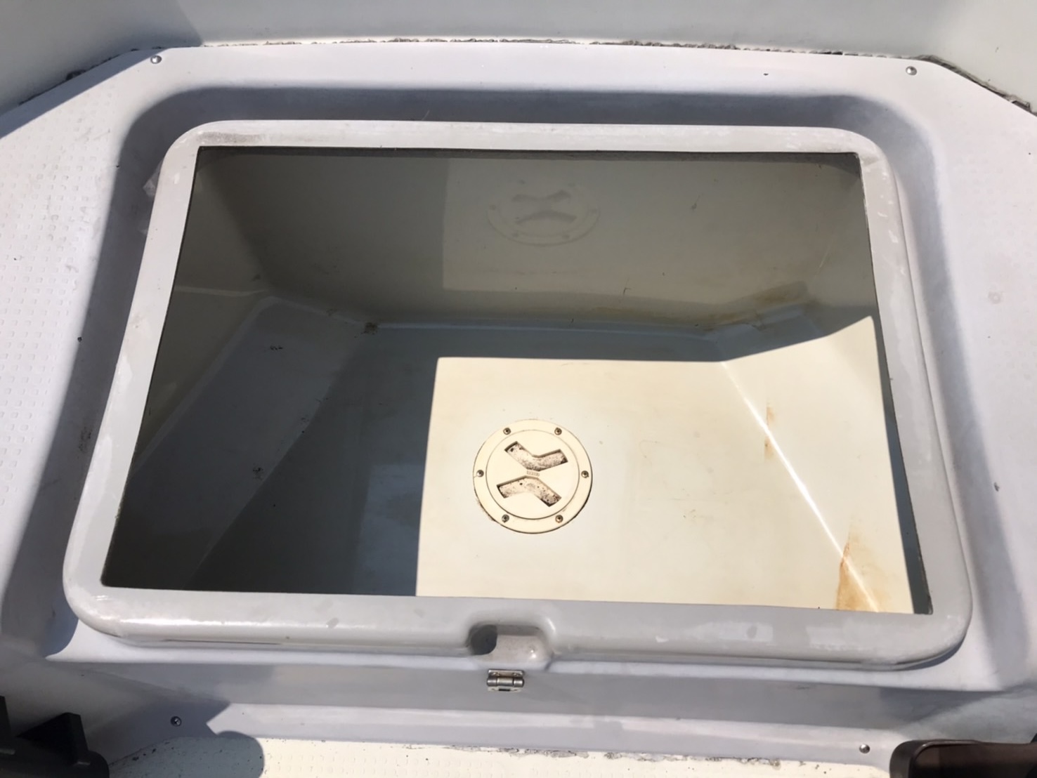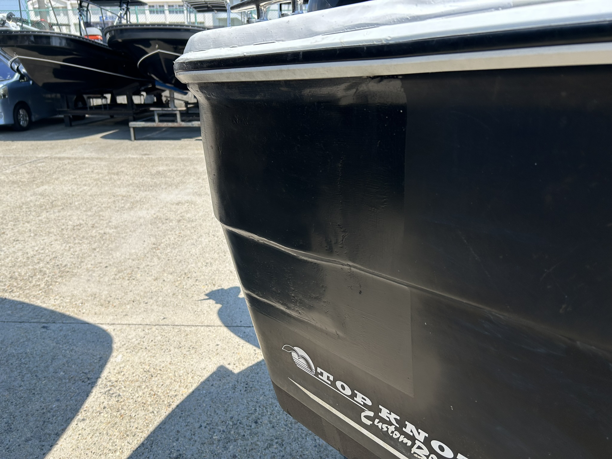 決して新しい船体では御座いませんがデッキのヘタリもなくまだまだ十分使用できる船です。船体右舷後部に修復跡有。