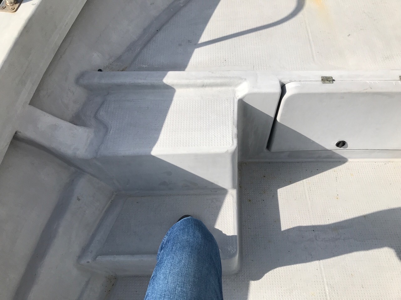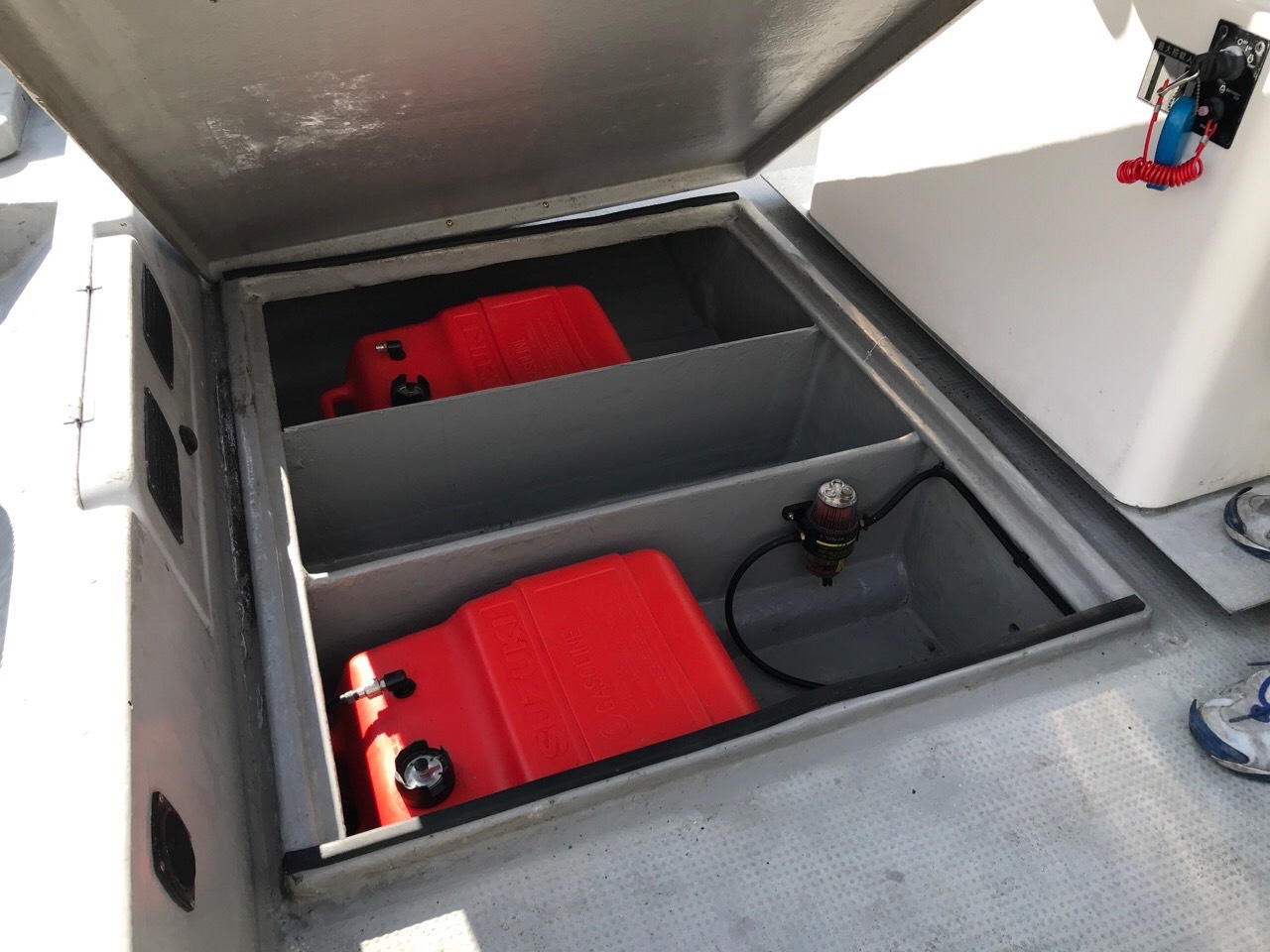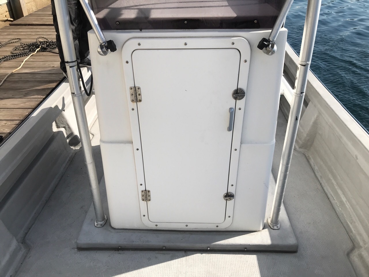 ヤマハW-33AFR中古船体のリメイク+DF115ATX(約350時間) 当社がヤマハW-33AFR中古艇を使用したカスタムボート。 船体特色としましては大型出艫(デトモ)が標準搭載・バウ側のブルワーク高さが高い事から 湾内より外洋を意識された船体構造。 当社で全塗装+新品エンジンを搭載してT-TOP,電動トイレ、油圧ステアリング等を当時全て新品にて搭載。 航海灯だけが搭載されてなかったので今回新品を艤装しました。 カスタム後3-4年経過してる船では有りますが、非常に良い状態を保っており、115馬力でマックス28ノットを 楽々出し、比較的波っけが有ったのですがスムーズな走りで走行。 また、エンジンは新品から僅か350時間しか回って無く点検整備したインプレッションとしまして 非常に状態も良く快調そのもの。 デッキ面に写ってる小ハッチ関連は完全にシールで埋めております。 また、コンソールスターン側の大型ハッチ中には大容量の物入れが有り、燃料タンクを 搭載できる様にしております。 ちょっと残念なのが船体ハルあちこちに有る補修用ペイントでの色ムラ。紫外線劣化で艶感に違いが出て 陸揚げした状態だと目立たないとは言えない状態。 その為、トップノットとしてはお求め易い価格で提供。