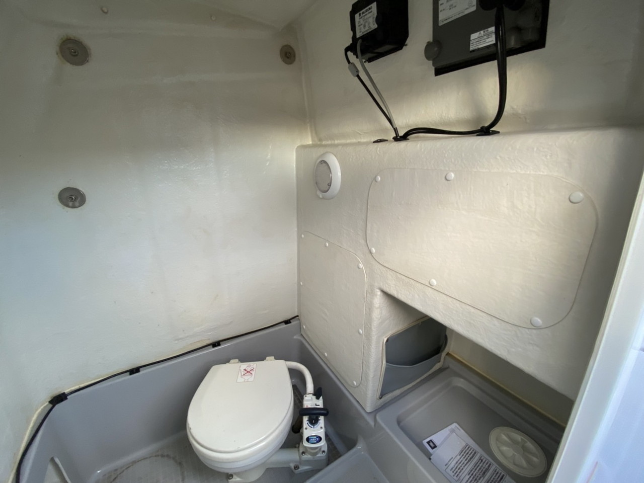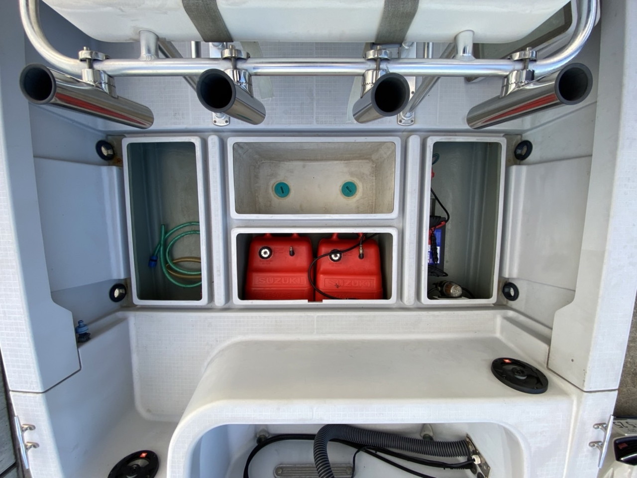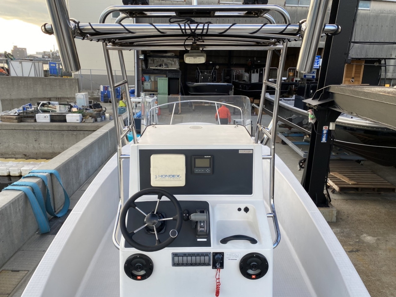 | 装備 | 燃料タンク(純正オプション約100L)・トップノットワンオフT-TOP(ステンレス)・HONDEX GPS魚探 8インチ・スズキデジタル表示メーター ・マリンステレオ一式・JBL新品マリンスピーカー搭載・BOSS4チャンネルアップ・マリントイレ・トランサムステップラダ・リーニングシート・ロッドホルダー等・ 航海灯・デッキウオッシュ・デッキライト関連・新品トップノットノブ付きステアリング等 |